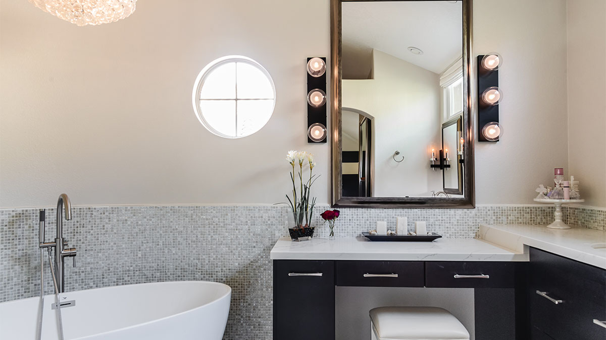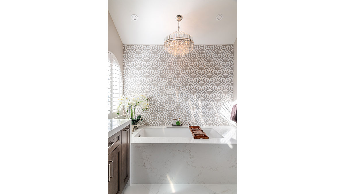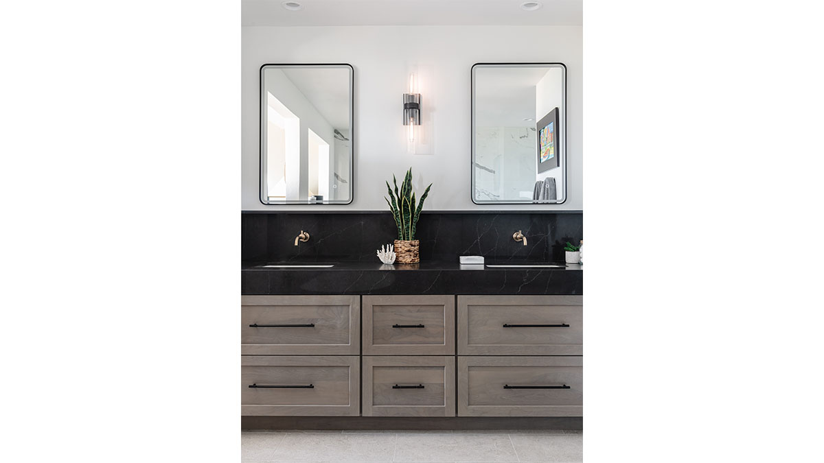 With no changes to the Master Bathroom’s footprint, we applied a total facelift to this space which is largely open to the Master Bedroom. The old vanity, which had the appearance of a dated furniture piece, was replaced with a sleek, new vanity with long, horizontal drawers and an extra thick countertop. Rounded square mirrors, linear lighting fixtures and a minimal white backsplash completes the peaceful, horizontal lines of the vanity space. The adjacent shower and toilet room becomes a second focal point with a wall of interlocking hexagon tiles and a horizontal shower niche. Wood tone LVP flooring adds a natural grounding as well as functionality to the space. The downstairs guest bath is hardly recognizable after a complete renewal, going from brown and dingy to white and bright. This space took on a whole new character when it was remodeled to match the nearby kitchen and family room areas. Upstairs, the fun and vibrant kid’s bathroom was designed with a growing young man in mind. The energetic black and white tile pattern invites you into the space, which is grounded with easy, masculine lines and a palette of comfortable neutrals, a design scheme that will take the user into his college years and beyond.