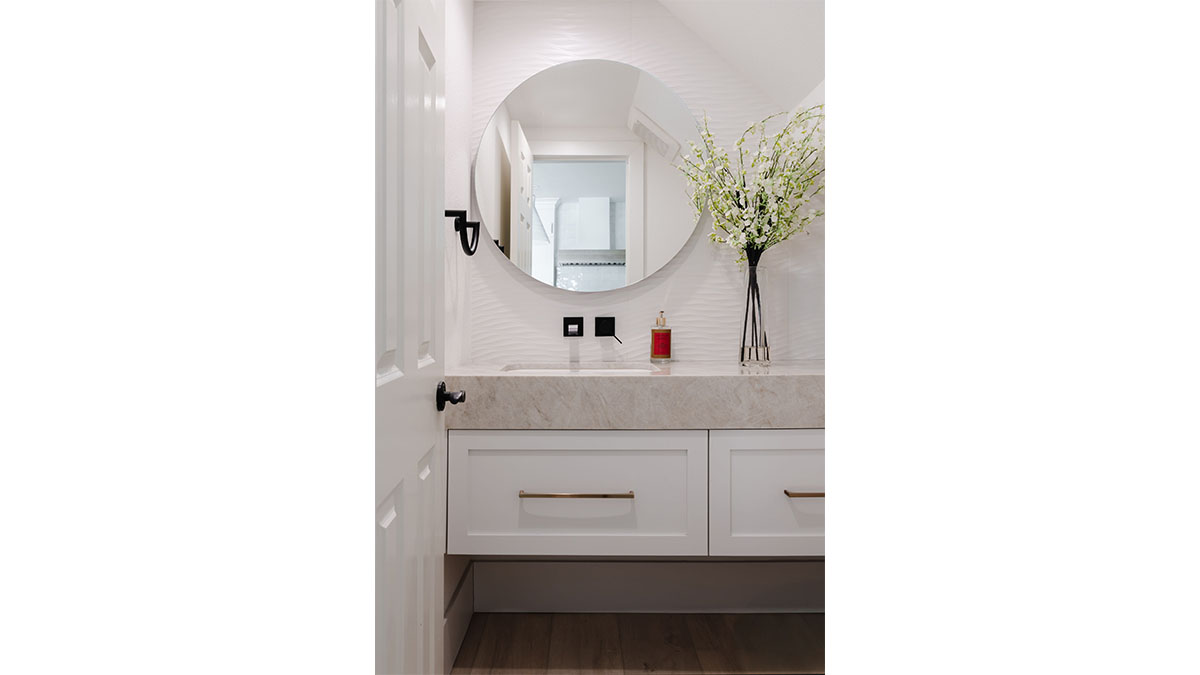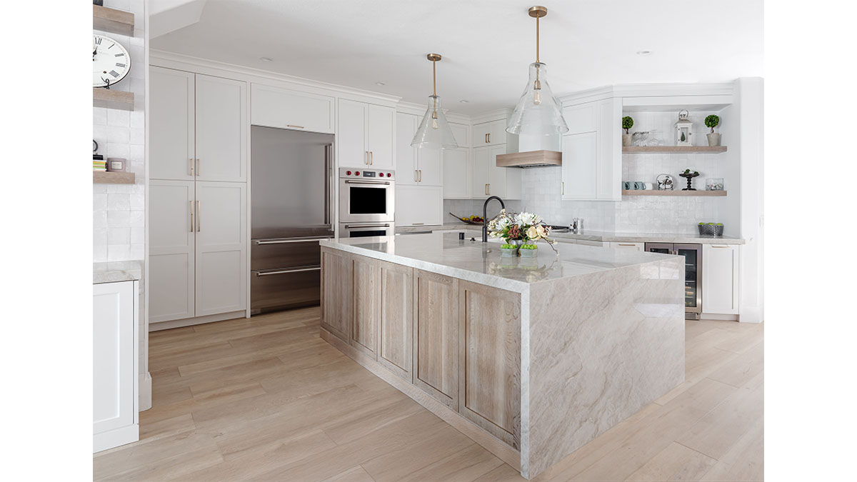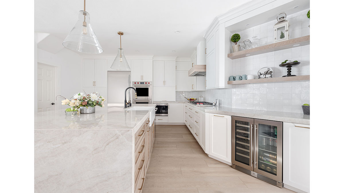 This beach home had a challenging long and narrow footprint. A pony wall and a dated niche blocked the kitchen area off from the family room. In removing both walls and the sink peninsula, the vista was greatly opened up and a gorgeous island was installed in place of the peninsula. A beautiful waterfall edge gives a clean and polished look to the island which contains a good assortment of storage – both drawers and doors. The sink, rotated to face into the family room, coheres the entire area, making it a more inclusive family space. New cabinetry and floating shelves where the old niche used to be contributes to the flow and beauty of the area. An angled wall, previously occupied by a tall cabinet, now houses a bar with a beverage fridge and floating shelves. A Wolf cooktop and double ovens, along with a Sub Zero refrigerator with freezer and vegetable drawers complete the appliance package for this small but highly functional kitchen.