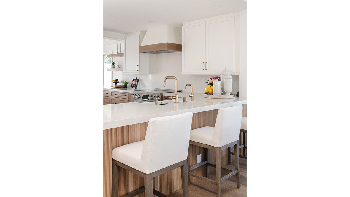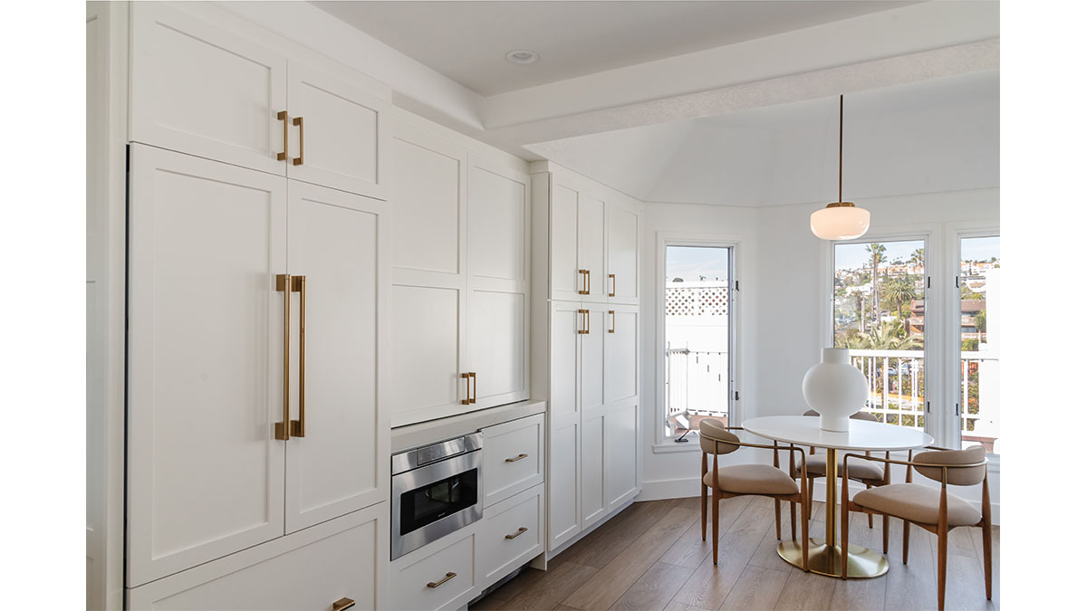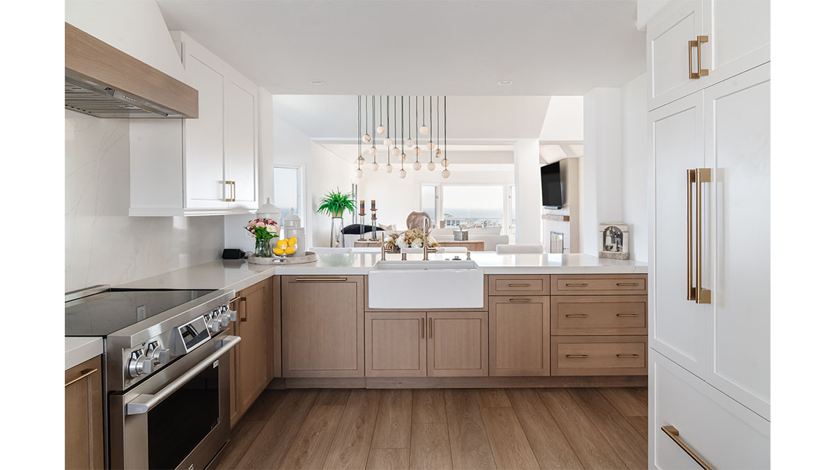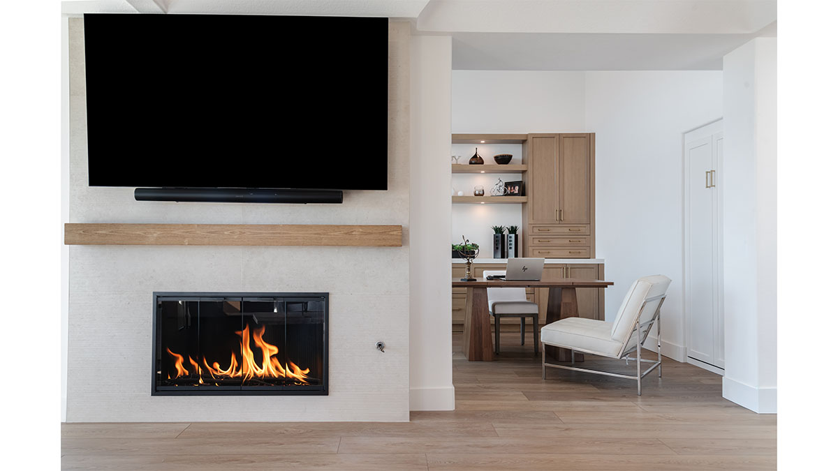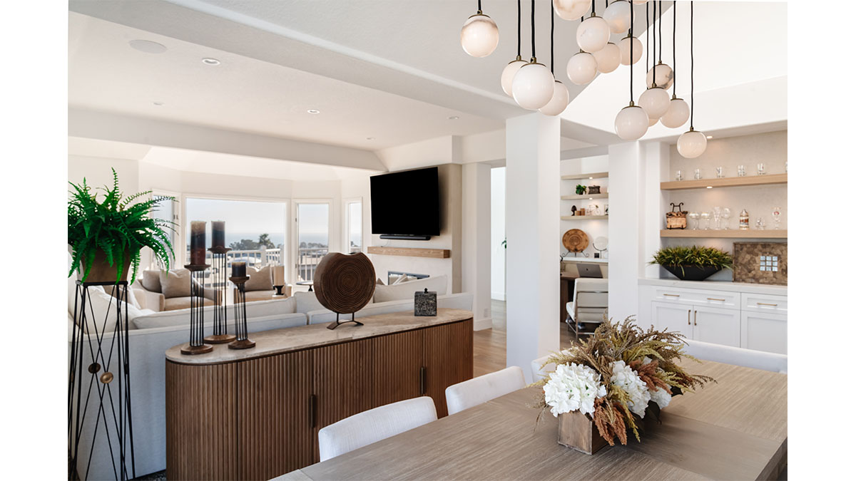 This spectacular oceanside condo offered 180-degree vistas of the ocean, along with the beautiful sunrises and sunsets that accompany them. A modernization of the space created a lighter, brighter interior, reflecting a simple elegance that allowed the views to shine through rather than compete with the older, darker configuration. The first step was to open up the kitchen and remove the soffits. A bright white and natural wood color scheme helped to bring in the light that the smaller opening over the peninsula and darker cabinets had been hiding. In addition, the view to the beach and the TV became more accessible from the kitchen, which also created a greater connection to the dining room, bar and family room. The three spaces in essence have become a multi-tiered great room, allowing free access and communication between the rooms. An understated bar at the end of the dining area displays a pair of floating shelves for showcasing crystal glassware. A hall niche was converted into a display cabinet for pottery and other decorative keepsakes. Below in the family room, a fireplace is tastefully finished in a coordinating stone, while a simple wood mantle ties in with the bar and the kitchen cabinets. To further customize the living areas, a small bedroom was converted into an office with a stylish, built-in credenza.