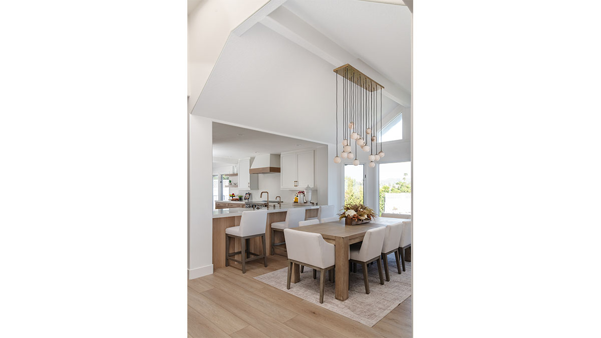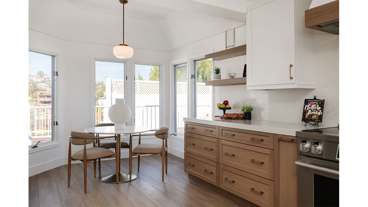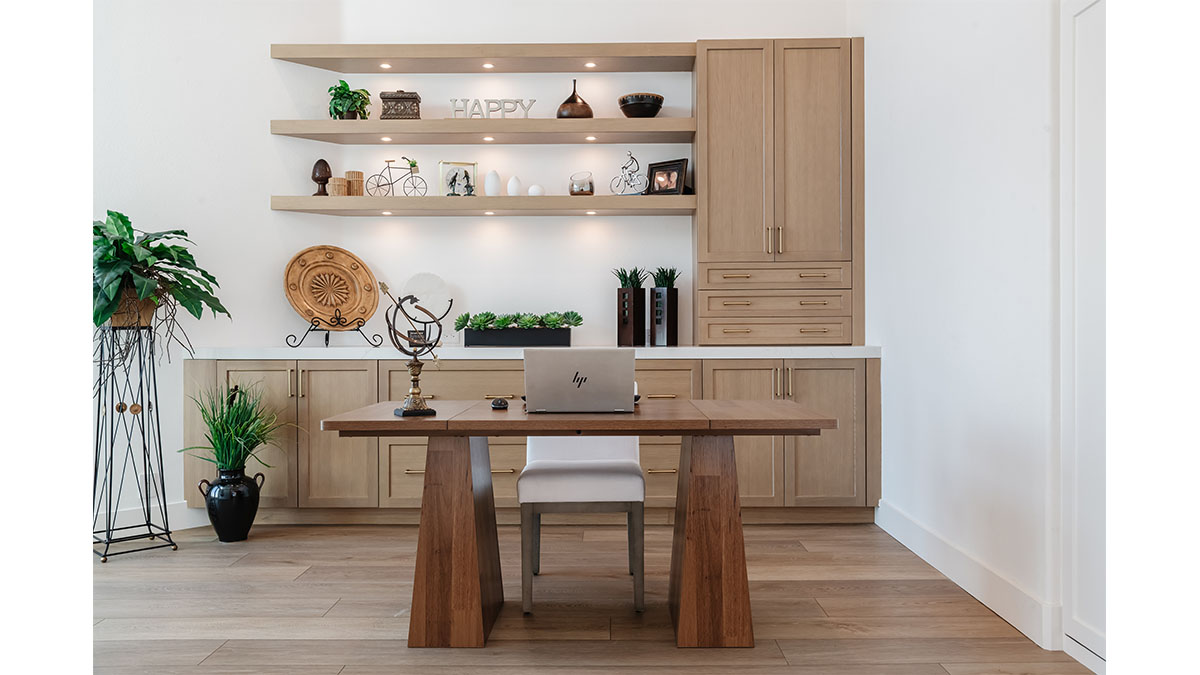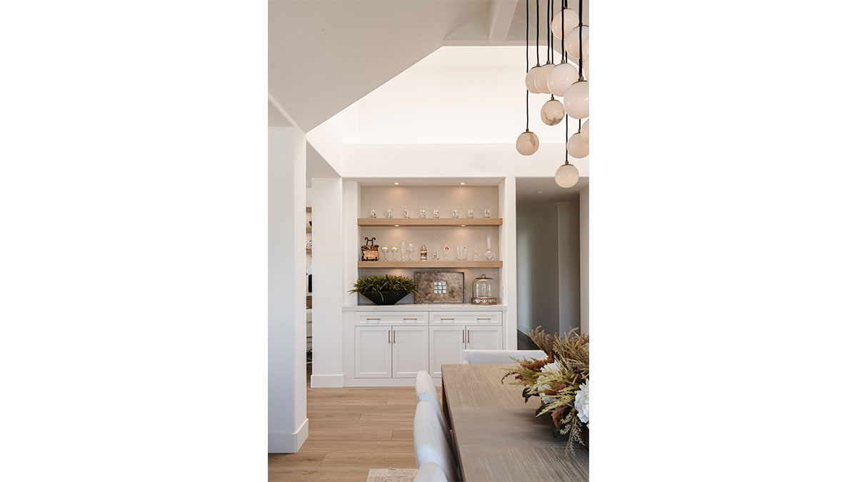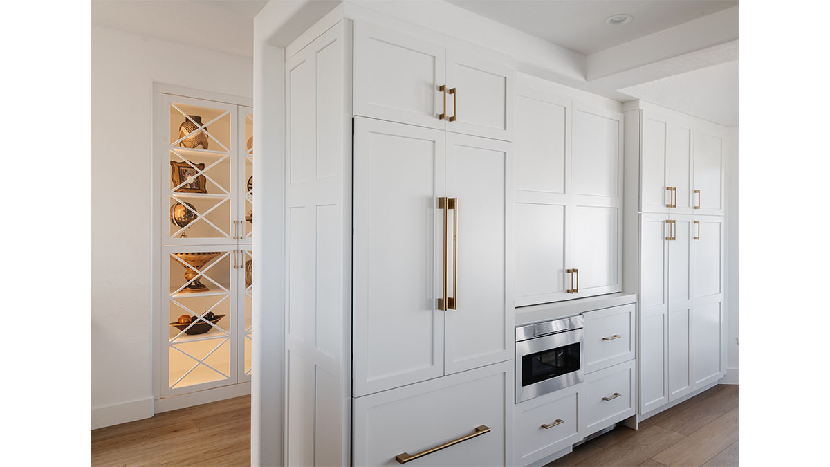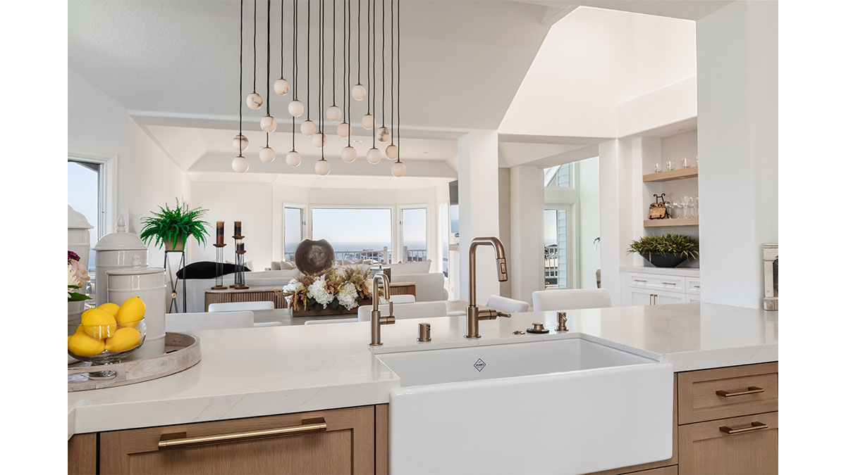 This spectacular oceanside condo offered 180-degree vistas of the ocean, along with the beautiful sunrises and sunsets that accompany them. A modernization of the space created a lighter, brighter interior, reflecting a simple elegance that allowed the views to shine through rather than compete with the older, darker configuration. The first step was to open up the kitchen and remove the soffits. A bright white and natural wood color scheme helped to bring in the light that the smaller opening over the peninsula and darker cabinets had been hiding. In addition, the view to the beach and the TV became more accessible from the kitchen, which also created a greater connection to the dining room, bar and family room. The three spaces in essence have become a multi-tiered great room, allowing free access and communication between the rooms. An understated bar at the end of the dining area displays a pair of floating shelves for showcasing crystal glassware. A hall niche was converted into a display cabinet for pottery and other decorative keepsakes. Below in the family room, a fireplace is tastefully finished in a coordinating stone, while a simple wood mantle ties in with the bar and the kitchen cabinets. To further customize the living areas, a small bedroom was converted into an office with a stylish, built-in credenza.