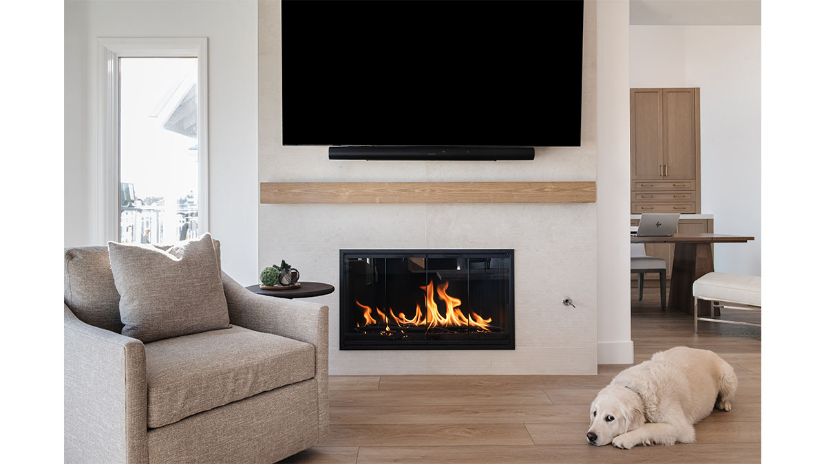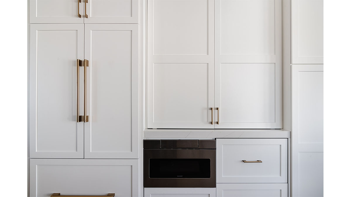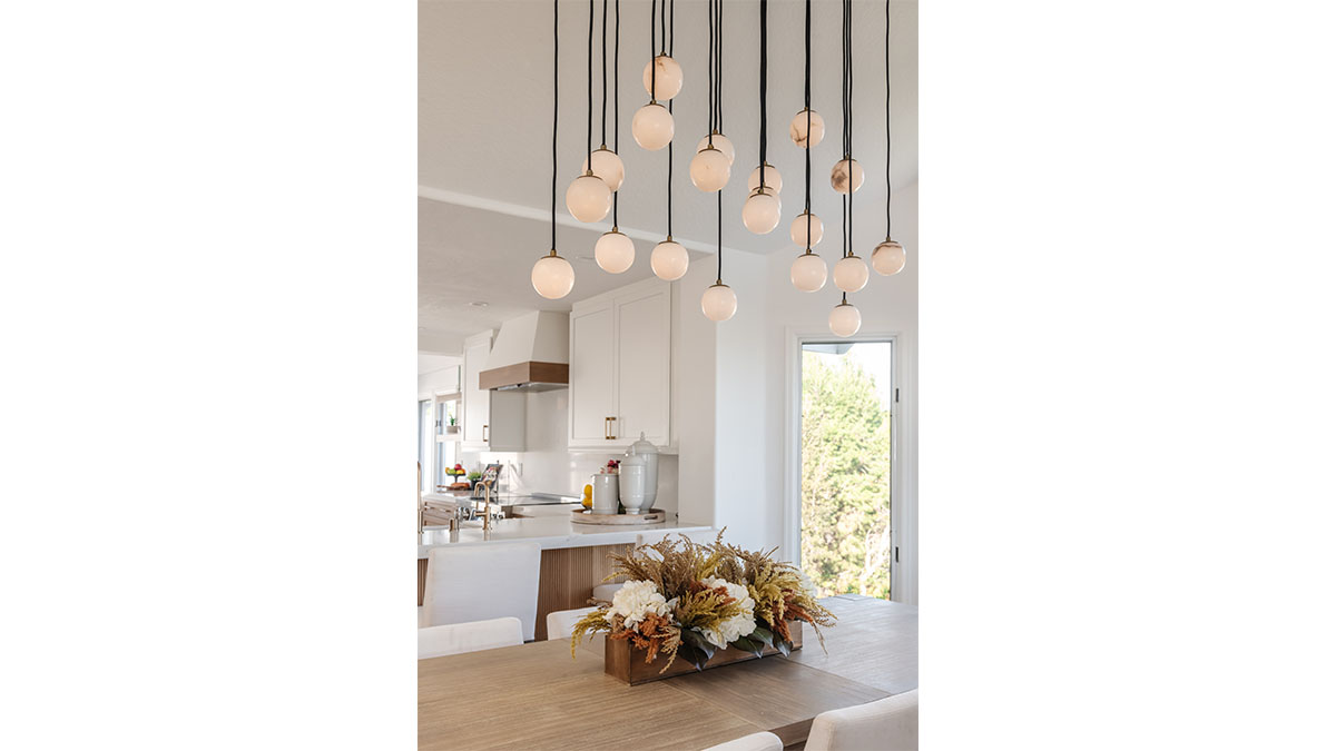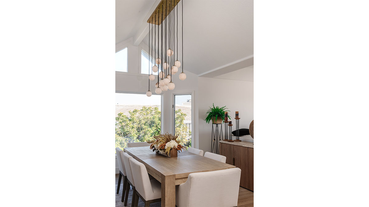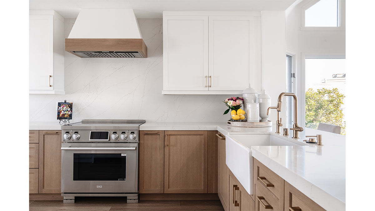 This spectacular oceanside condo offered 180-degree vistas of the ocean, along with the beautiful sunrises and sunsets that accompany them. A modernization of the space created a lighter, brighter interior, reflecting a simple elegance that allowed the views to shine through rather than compete with the older, darker configuration. The first step was to open up the kitchen and remove the soffits. A bright white and natural wood color scheme helped to bring in the light that the smaller opening over the peninsula and darker cabinets had been hiding. In addition, the view to the beach and the TV became more accessible from the kitchen, which also created a greater connection to the dining room, bar and family room. The three spaces in essence have become a multi-tiered great room, allowing free access and communication between the rooms. An understated bar at the end of the dining area displays a pair of floating shelves for showcasing crystal glassware. A hall niche was converted into a display cabinet for pottery and other decorative keepsakes. Below in the family room, a fireplace is tastefully finished in a coordinating stone, while a simple wood mantle ties in with the bar and the kitchen cabinets. To further customize the living areas, a small bedroom was converted into an office with a stylish, built-in credenza.
