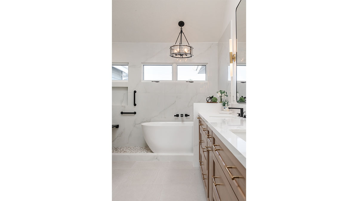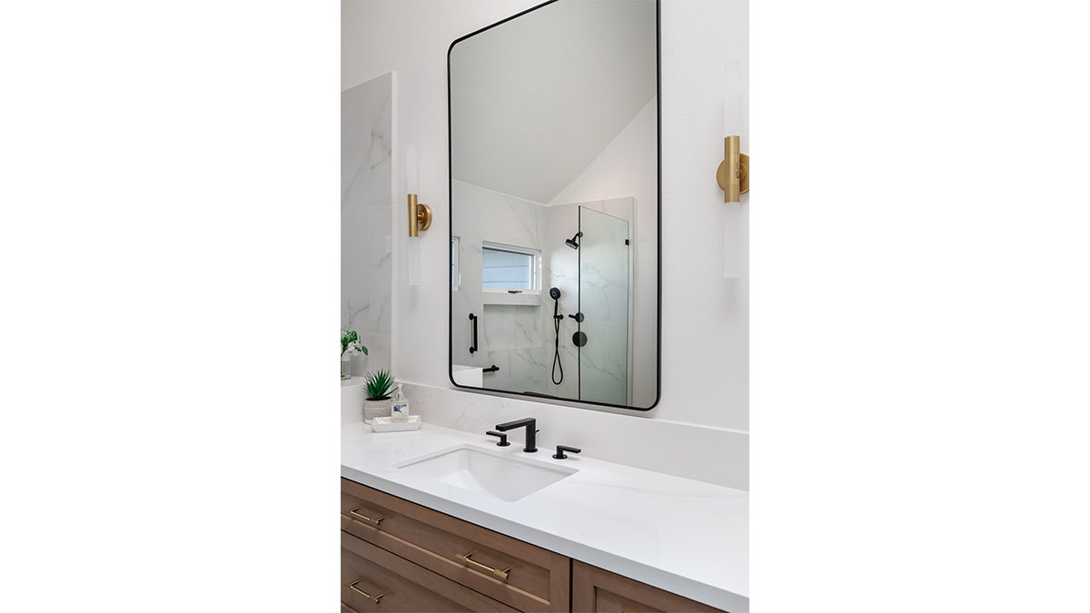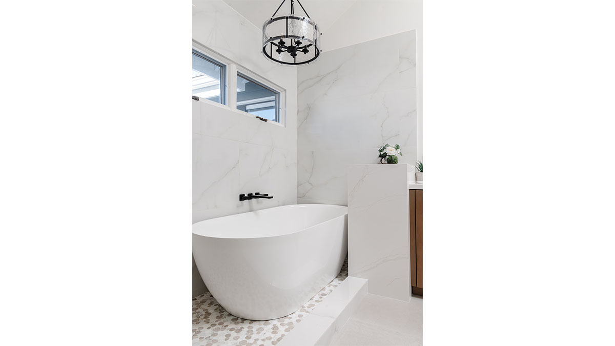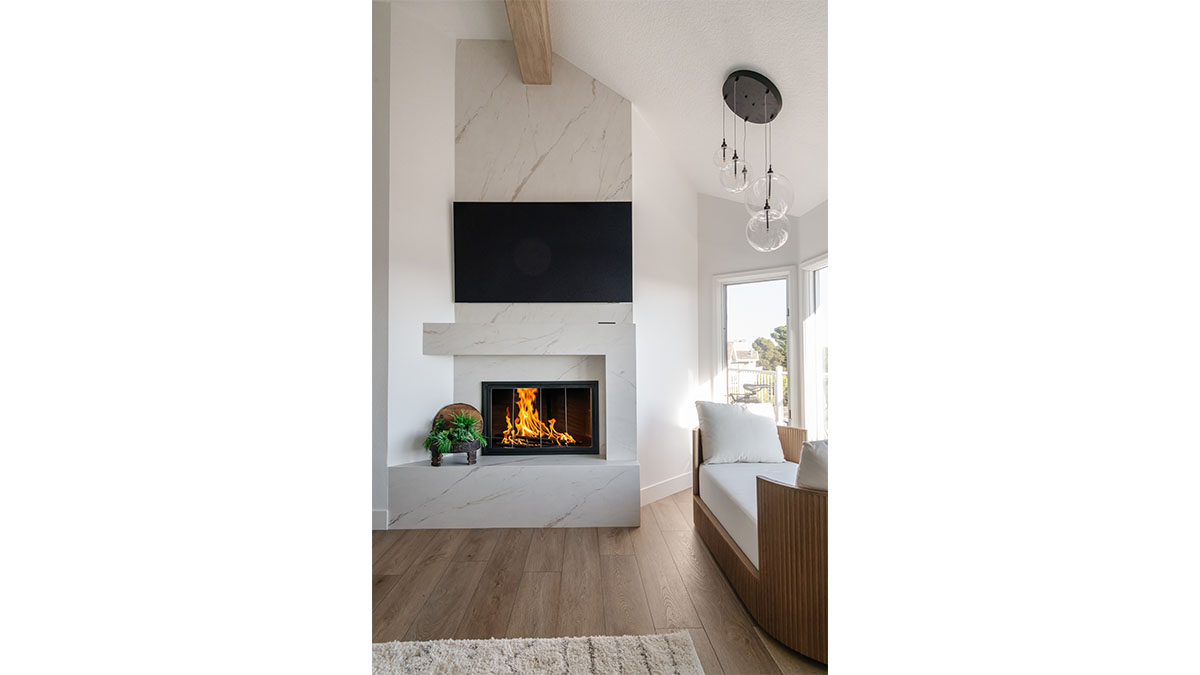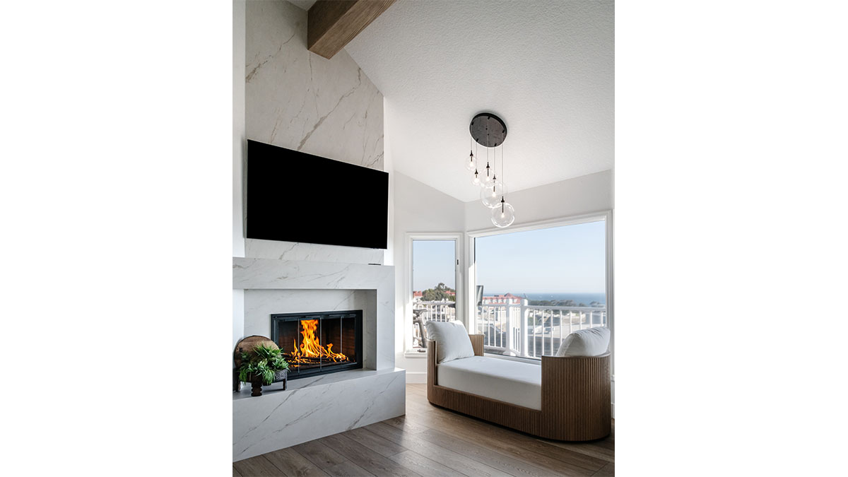 A long, narrow master bath looked heavy with extensive travertine, black granite countertops and lots of wall soffits. We removed the wall soffits and replaced the stone with white veined quartz to lighten, brighen and modernize the space. A wet room at the far end of the new bath configuration contains a small free standing tub and an organic pennyround base tile. Black hardware provides an accent while offering contrast and anchoring the room. The natural wood tone cabinets tie in with the kitchen and office cabinetry, all of which were installed at the same time in this extensive whole home remodel. An inviting retreat in the master bedroom offers a marvelous ocean view; we refinished the fireplace to harmonize with the home’s quiet, contemporary feel.