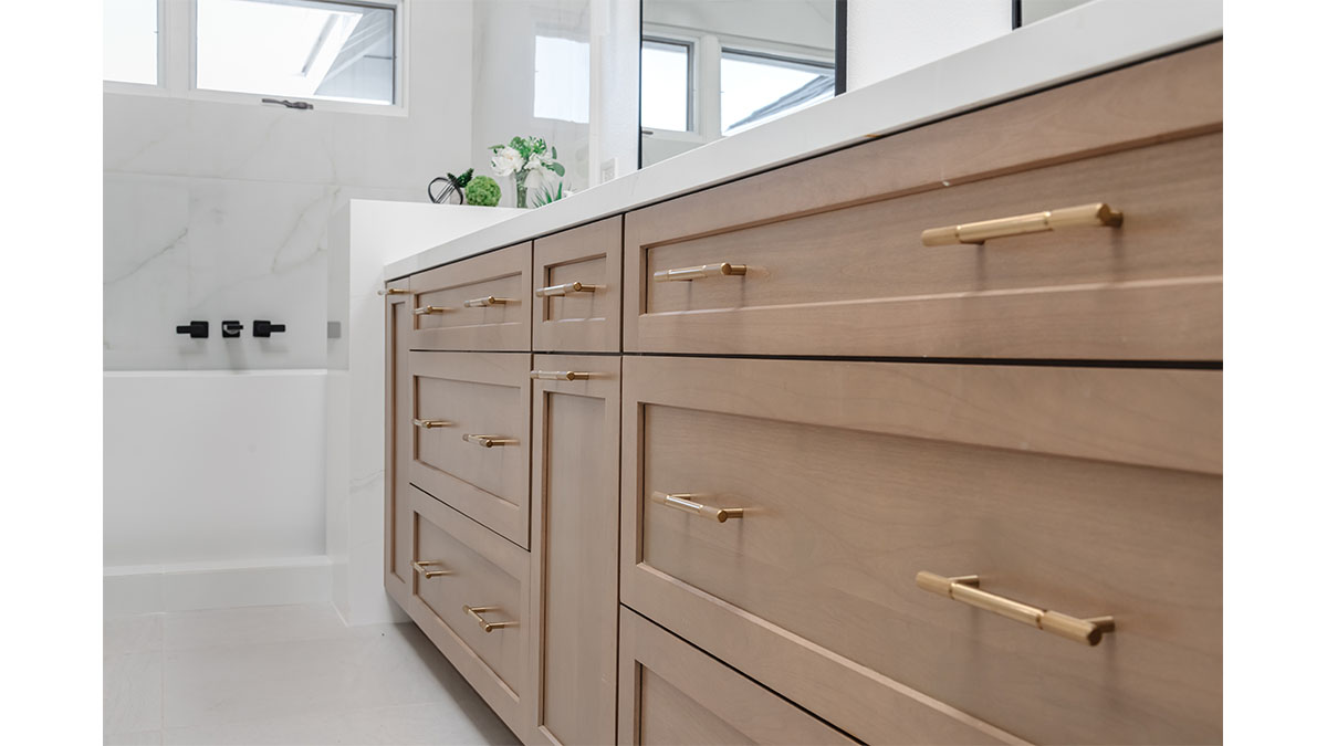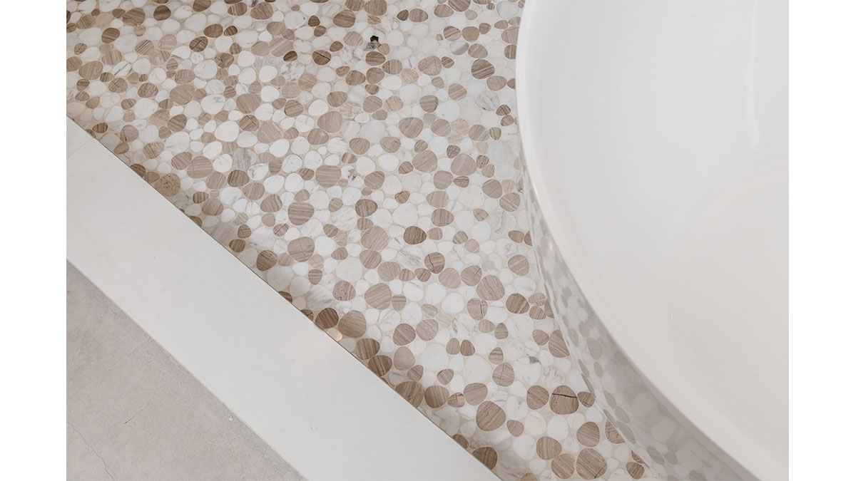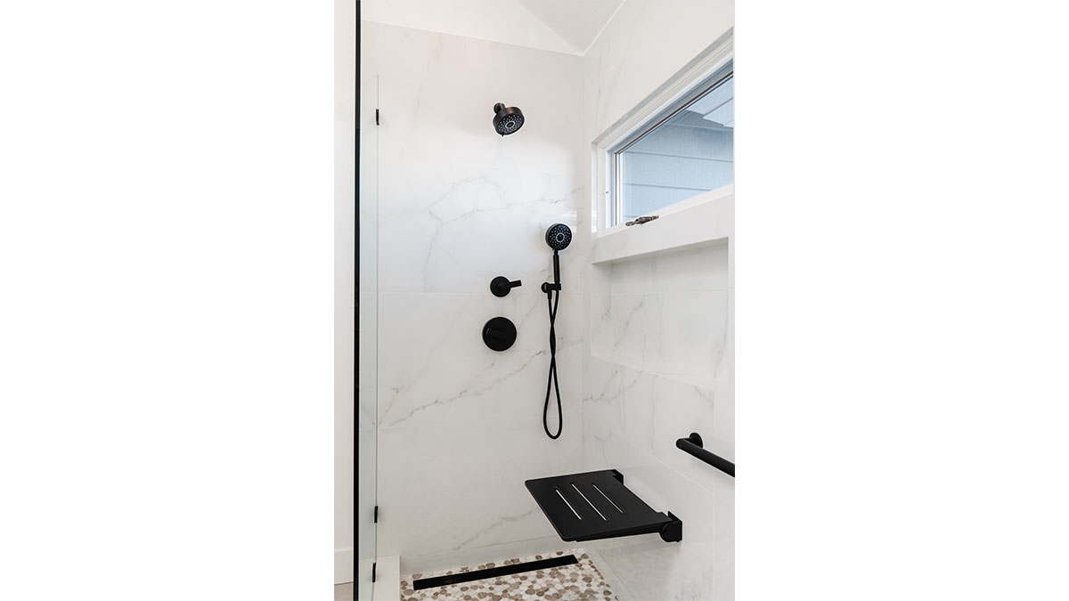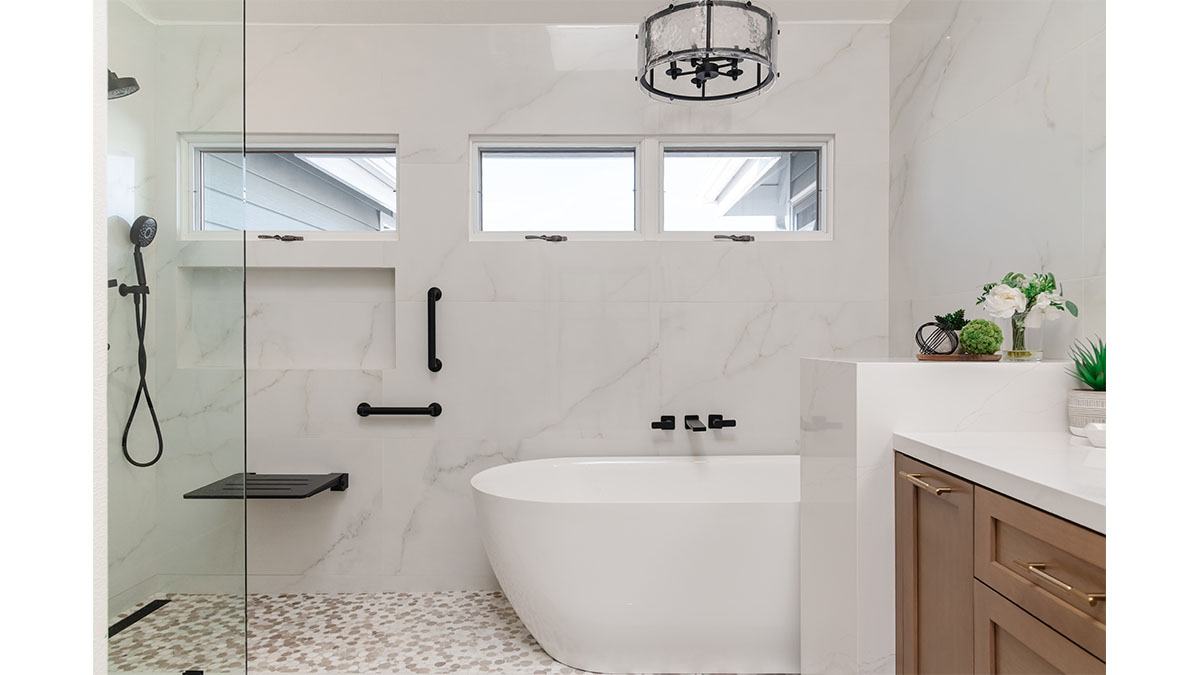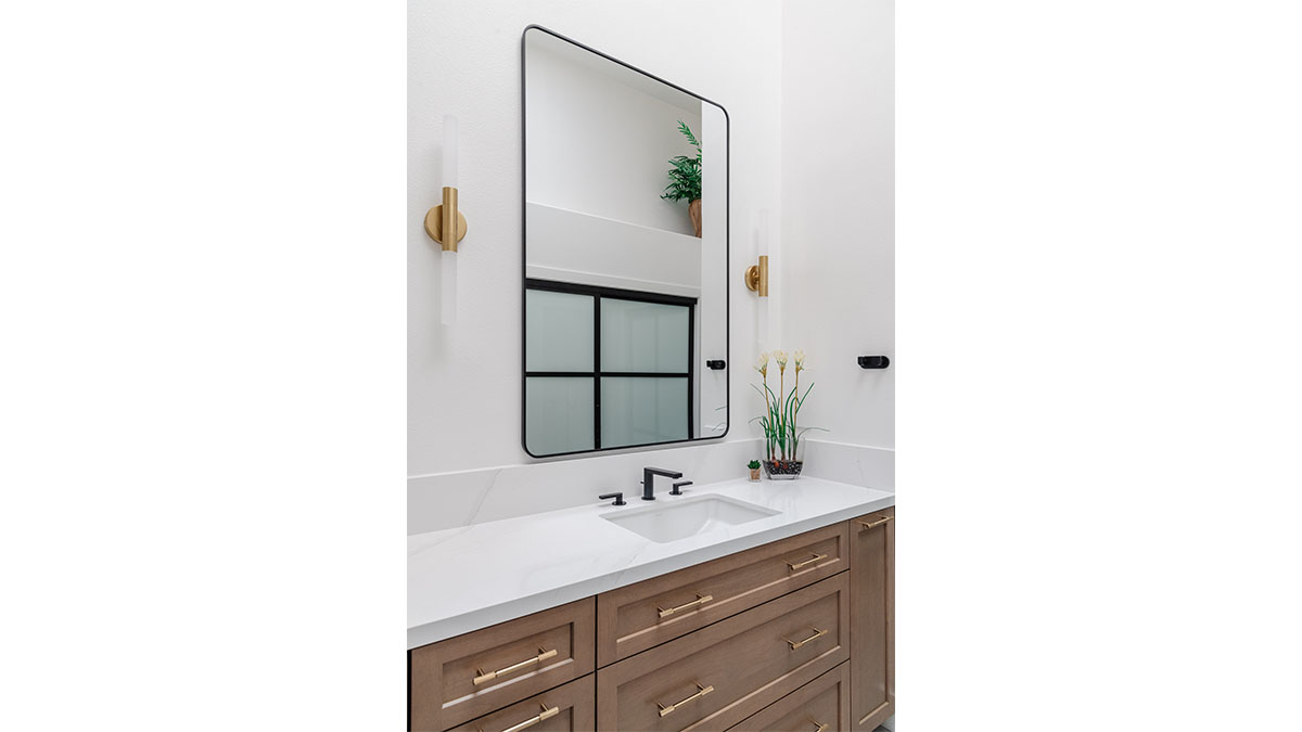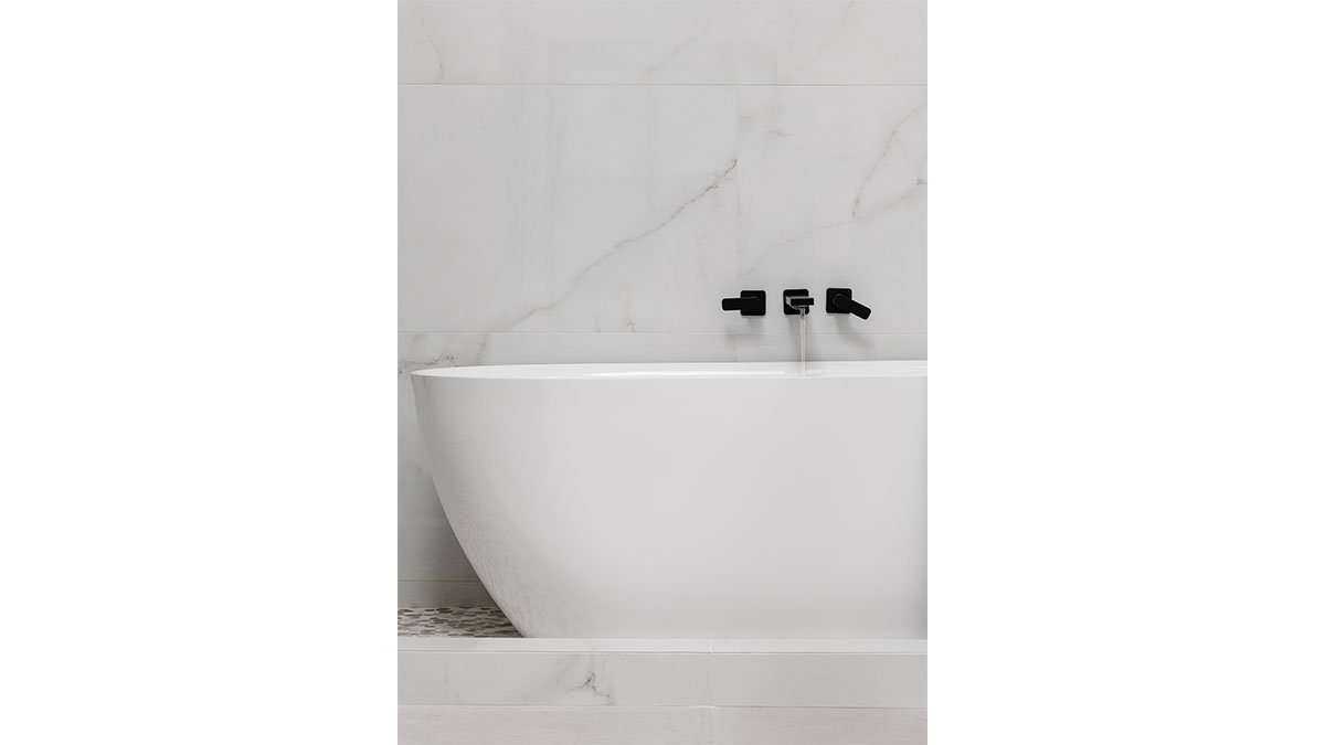 A long, narrow master bath looked heavy with extensive travertine, black granite countertops and lots of wall soffits. We removed the wall soffits and replaced the stone with white veined quartz to lighten, brighen and modernize the space. A wet room at the far end of the new bath configuration contains a small free standing tub and an organic pennyround base tile. Black hardware provides an accent while offering contrast and anchoring the room. The natural wood tone cabinets tie in with the kitchen and office cabinetry, all of which were installed at the same time in this extensive whole home remodel. An inviting retreat in the master bedroom offers a marvelous ocean view; we refinished the fireplace to harmonize with the home’s quiet, contemporary feel.