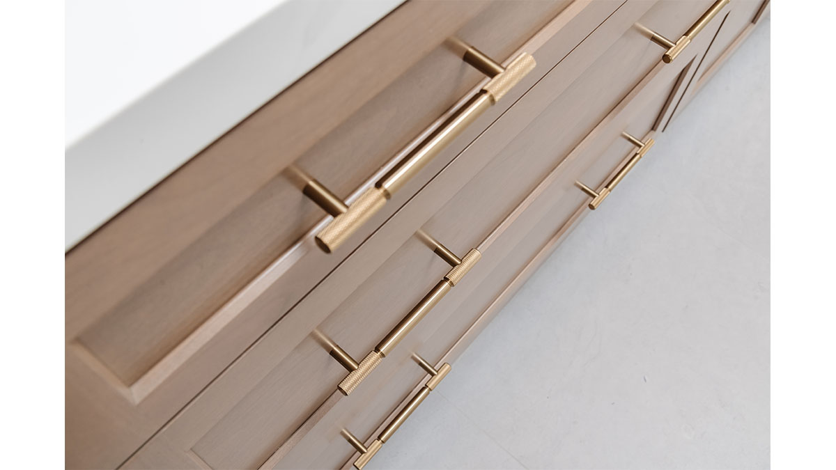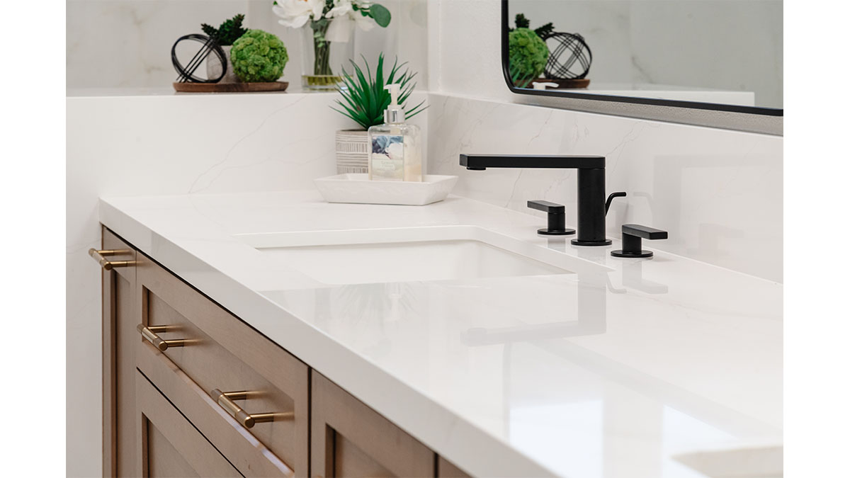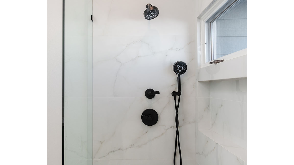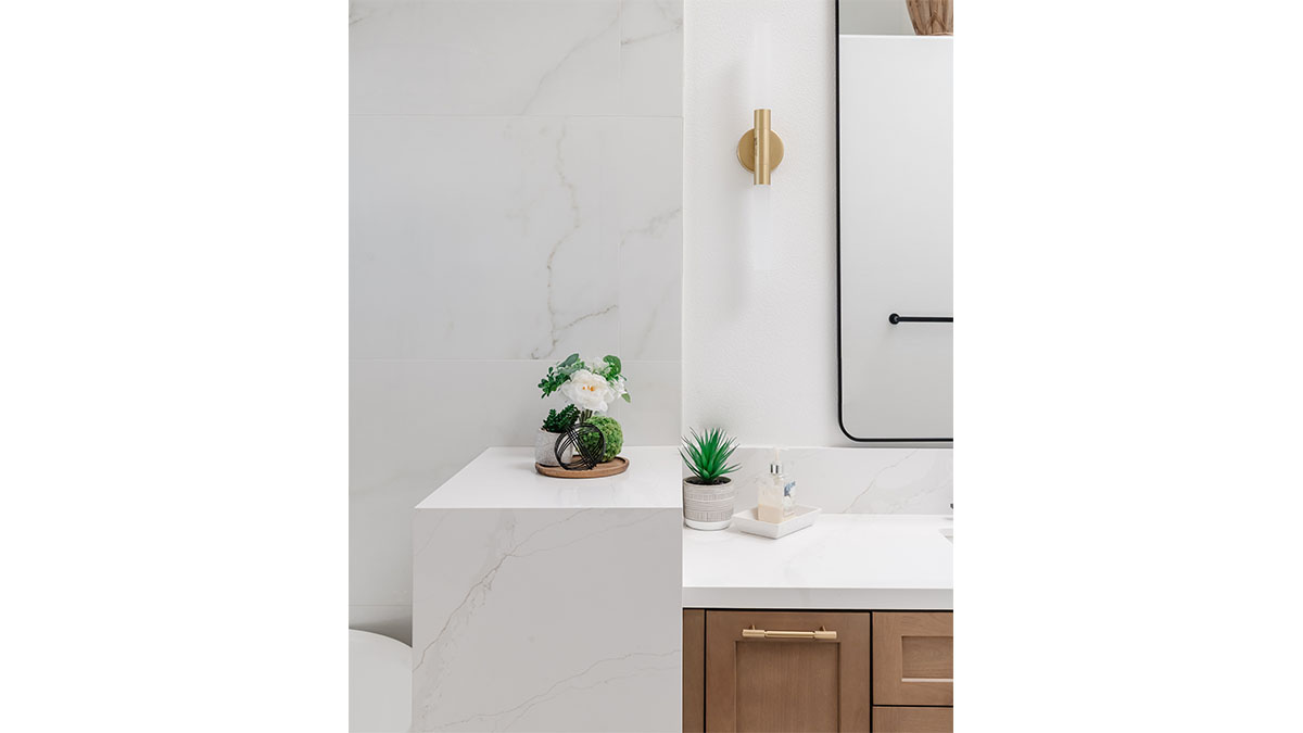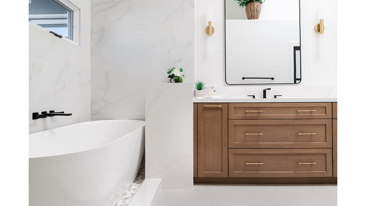 A long, narrow master bath looked heavy with extensive travertine, black granite countertops and lots of wall soffits. We removed the wall soffits and replaced the stone with white veined quartz to lighten, brighen and modernize the space. A wet room at the far end of the new bath configuration contains a small free standing tub and an organic pennyround base tile. Black hardware provides an accent while offering contrast and anchoring the room. The natural wood tone cabinets tie in with the kitchen and office cabinetry, all of which were installed at the same time in this extensive whole home remodel. An inviting retreat in the master bedroom offers a marvelous ocean view; we refinished the fireplace to harmonize with the home’s quiet, contemporary feel.
