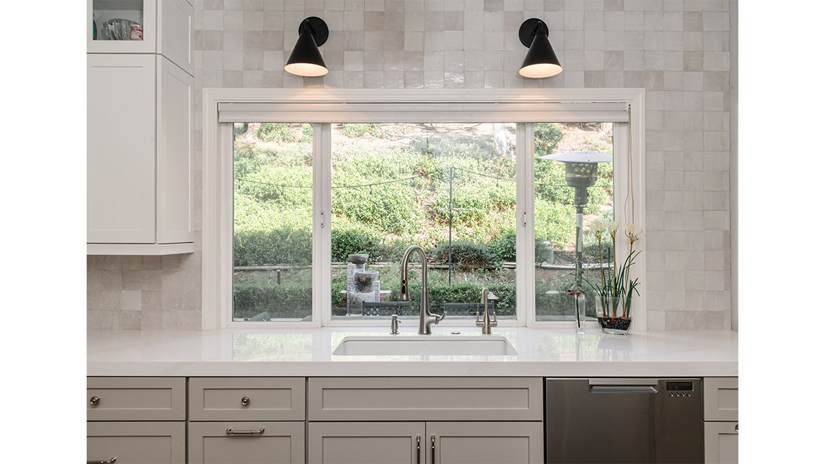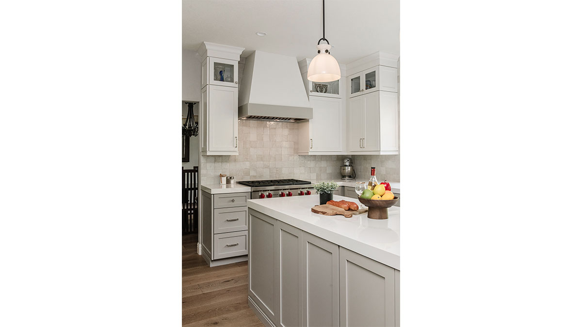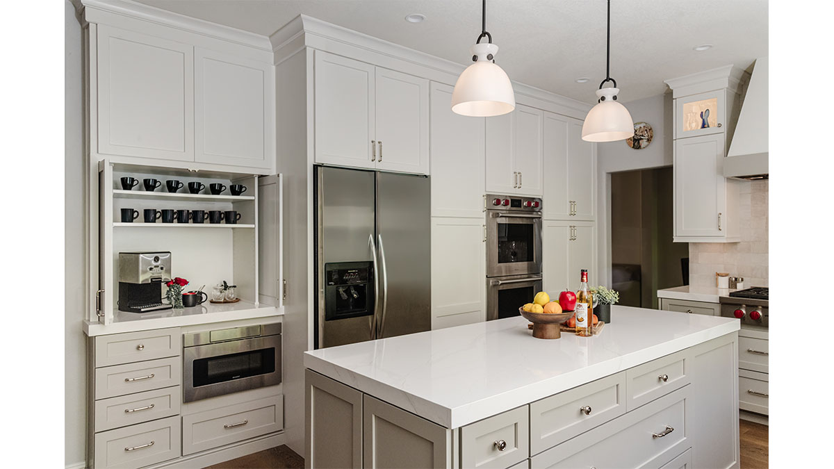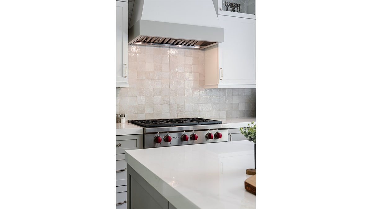 Simplified, clean, modern & functional would describe this finished kitchen. The original 1990s space was encumbered with posts and arches over the sink wall, making this narrow space seem even narrower. Our first step in simplifying the room was removing all the architectural superfluity and the ceiling soffit. We also removed the step-in pantry at the end of the fridge wall where it meets the family room and bar. We refashioned the island to serve as a workspace with storage, omitting seating because the homeowner didn’t need it. Faux doors at the family room end of the island finished the piece handsomely. Where the pantry used to be, we built a coffee bar and added a microwave drawer. The coffee bar is hidden behind the pocket doors of an appliance garage. We kept the wall ovens and built a cabinet pantry on the same wall, allowing for a convenient cooking triangle. The Wolf range top and custom hood offer a nice focal point with a backsplash of hand made clay tile for texture and variety. The lighted transom cabinets on either side of the hood and flanking the window provide texture, light and interest for displaying the clients’ cherished items. The hand made clay backsplash extends across the sink wall for unity and design coherence.