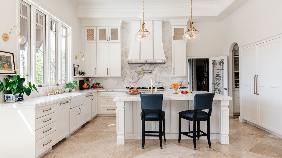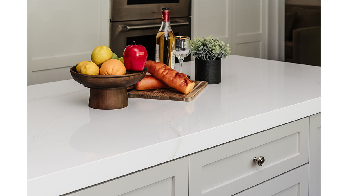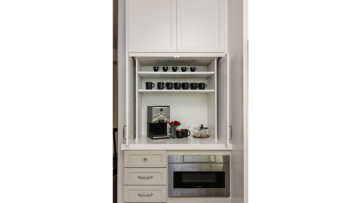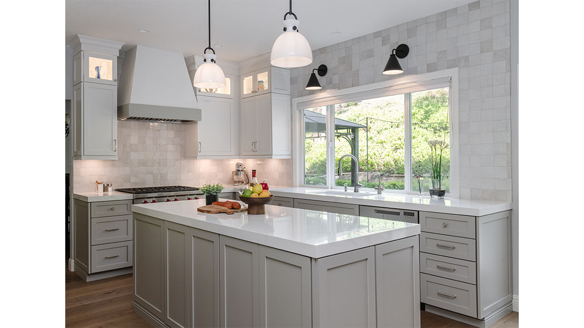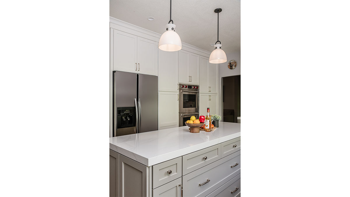 Simplified, clean, modern & functional would describe this finished kitchen. The original 1990s space was encumbered with posts and arches over the sink wall, making this narrow space seem even narrower. Our first step in simplifying the room was removing all the architectural superfluity and the ceiling soffit. We also removed the step-in pantry at the end of the fridge wall where it meets the family room and bar. We refashioned the island to serve as a workspace with storage, omitting seating because the homeowner didn’t need it. Faux doors at the family room end of the island finished the piece handsomely. Where the pantry used to be, we built a coffee bar and added a microwave drawer. The coffee bar is hidden behind the pocket doors of an appliance garage. We kept the wall ovens and built a cabinet pantry on the same wall, allowing for a convenient cooking triangle. The Wolf range top and custom hood offer a nice focal point with a backsplash of hand made clay tile for texture and variety. The lighted transom cabinets on either side of the hood and flanking the window provide texture, light and interest for displaying the clients’ cherished items. The hand made clay backsplash extends across the sink wall for unity and design coherence.