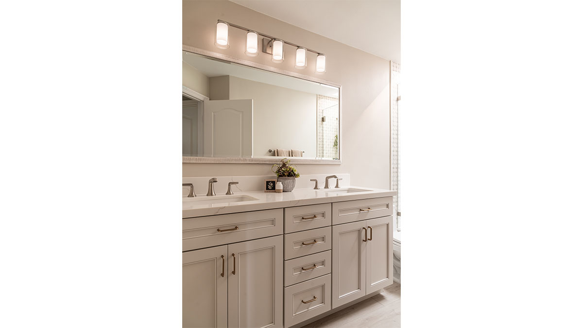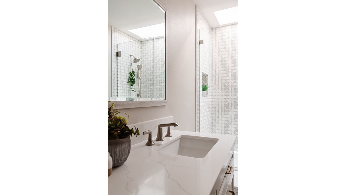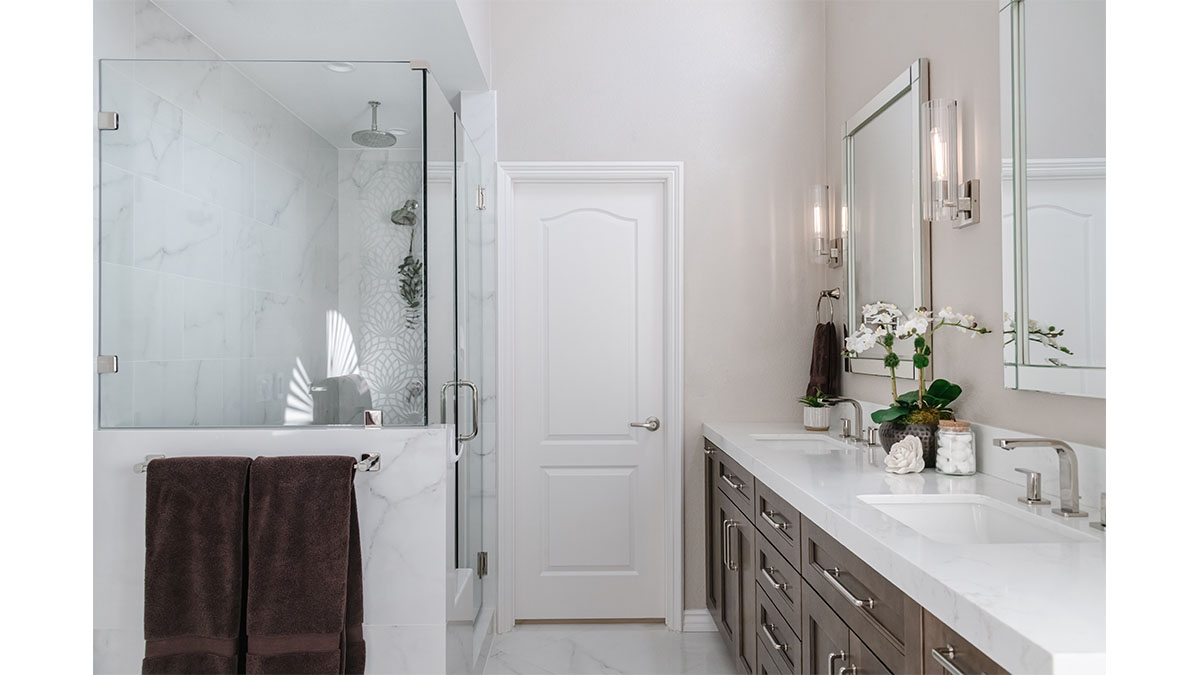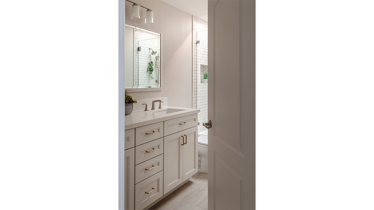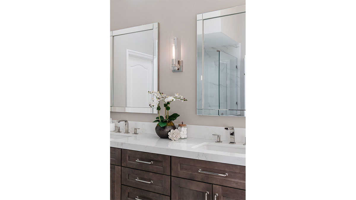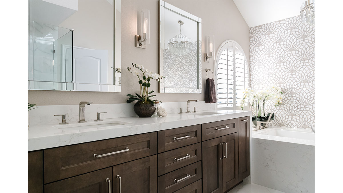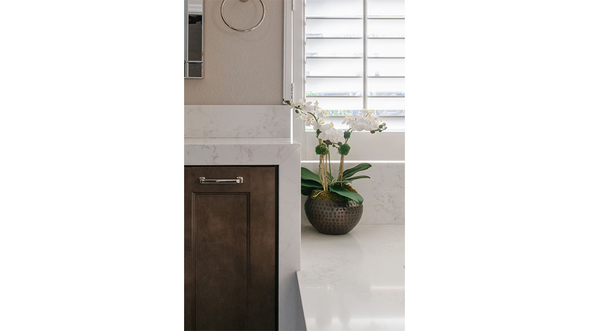 A client with Traditional tastes wanted an overhaul to their builder-grade bathrooms, while still retaining their Traditional style. The Master Bath was a long, narrow space with 2 focal points – the built-in tub at the end of the room, and the vanity which faced the entry. We gave a facelift to both areas with an updated choice of materials and a modern take on the Traditional theme. Replacing the old fiberglass tub with a sleek, rectangular drop-in model, we enclosed it in a quartz platform to match the countertop. To replace the old mirror above the tub, we used a show-stopping backsplash that brings both beauty and elegance to the room. A new vanity of Decora cabinets in Maple Kindling finish, a rich brown, tied in beautifully with the backsplash and quartz. For a sophisticated touch, the counter transitions to a waterfall edge, connecting it to the tub platform. Personalized storage, such as the makeup organizer, adds convenience to the client’s routine. The shower, at the other end of the room is tied in beautifully with a coordinating porcelain. Beveled framed mirrors and a crystal chandelier are refined finishing touches. Each of the guest bathrooms was also refreshed with a modern take on the Traditional theme.