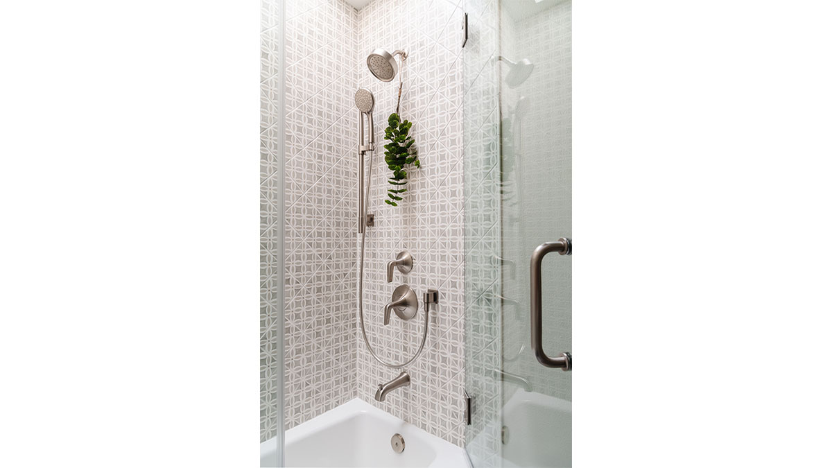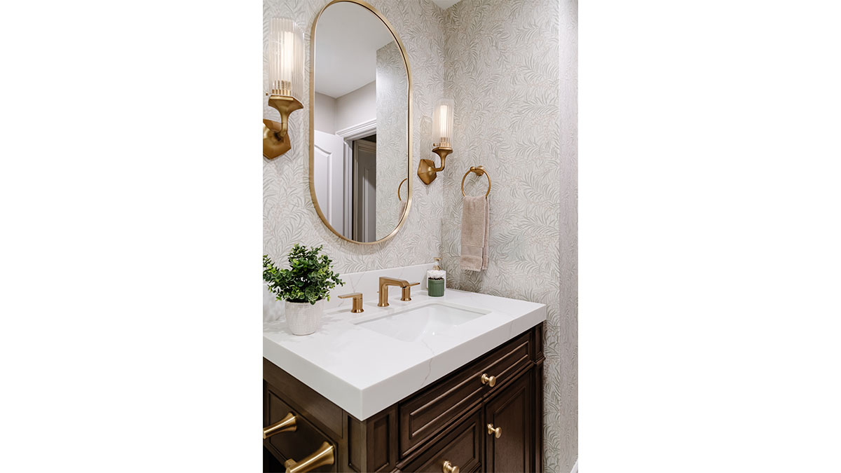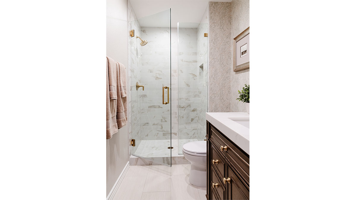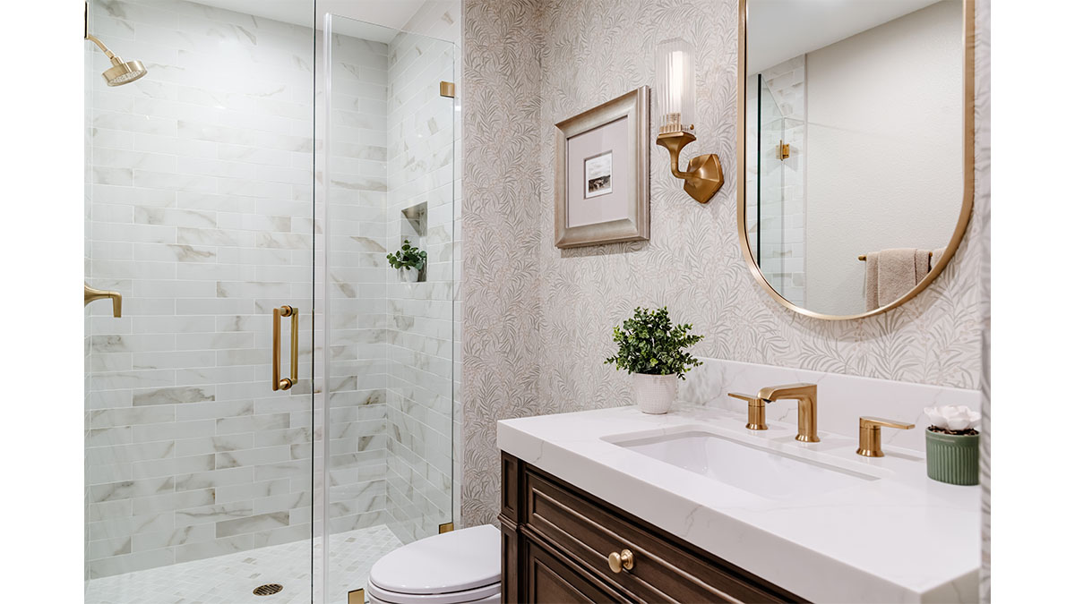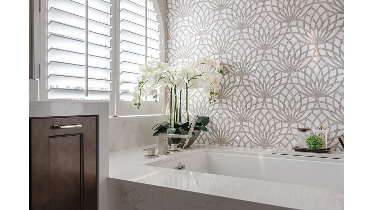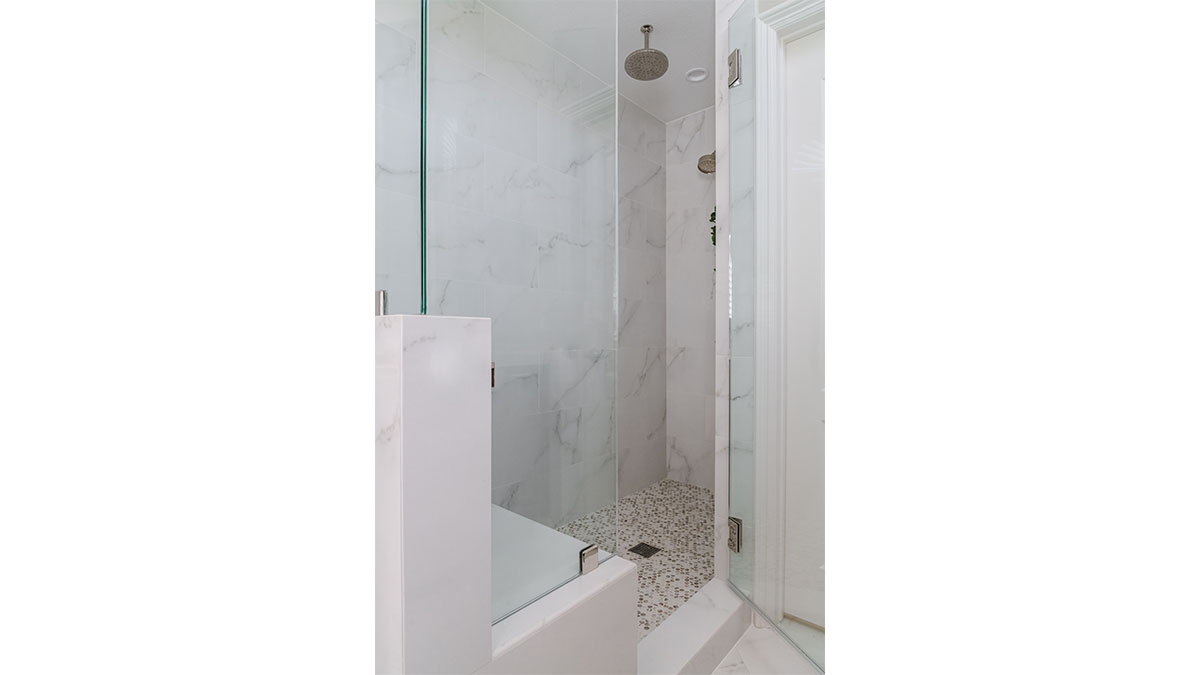 A client with Traditional tastes wanted an overhaul to their builder-grade bathrooms, while still retaining their Traditional style. The Master Bath was a long, narrow space with 2 focal points – the built-in tub at the end of the room, and the vanity which faced the entry. We gave a facelift to both areas with an updated choice of materials and a modern take on the Traditional theme. Replacing the old fiberglass tub with a sleek, rectangular drop-in model, we enclosed it in a quartz platform to match the countertop. To replace the old mirror above the tub, we used a show-stopping backsplash that brings both beauty and elegance to the room. A new vanity of Decora cabinets in Maple Kindling finish, a rich brown, tied in beautifully with the backsplash and quartz. For a sophisticated touch, the counter transitions to a waterfall edge, connecting it to the tub platform. Personalized storage, such as the makeup organizer, adds convenience to the client’s routine. The shower, at the other end of the room is tied in beautifully with a coordinating porcelain. Beveled framed mirrors and a crystal chandelier are refined finishing touches. Each of the guest bathrooms was also refreshed with a modern take on the Traditional theme.