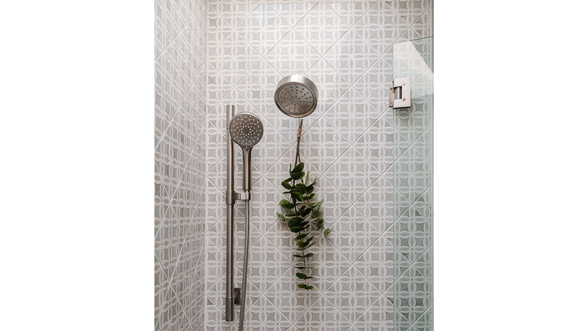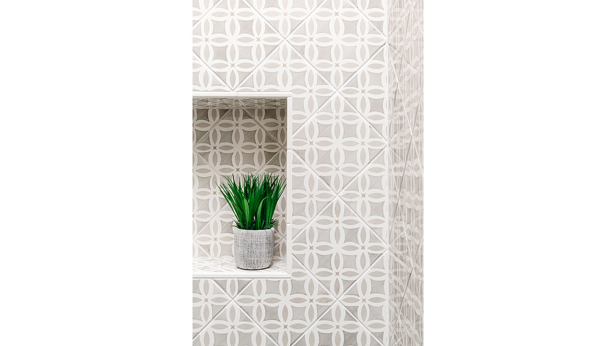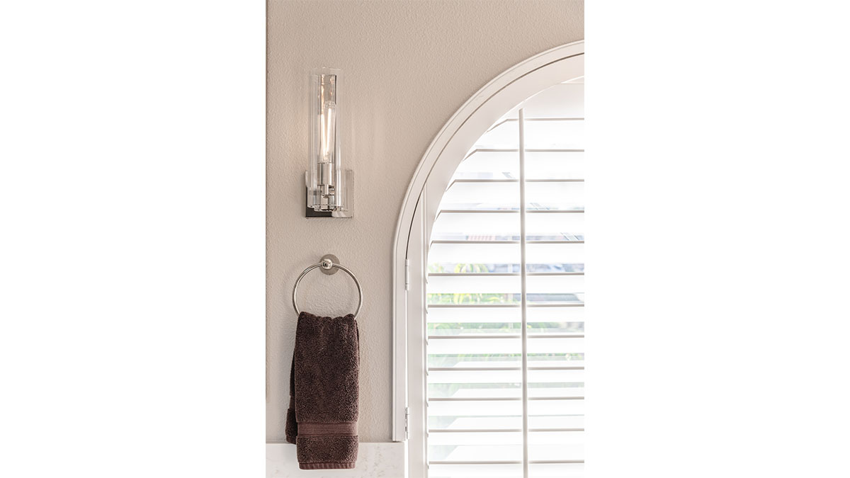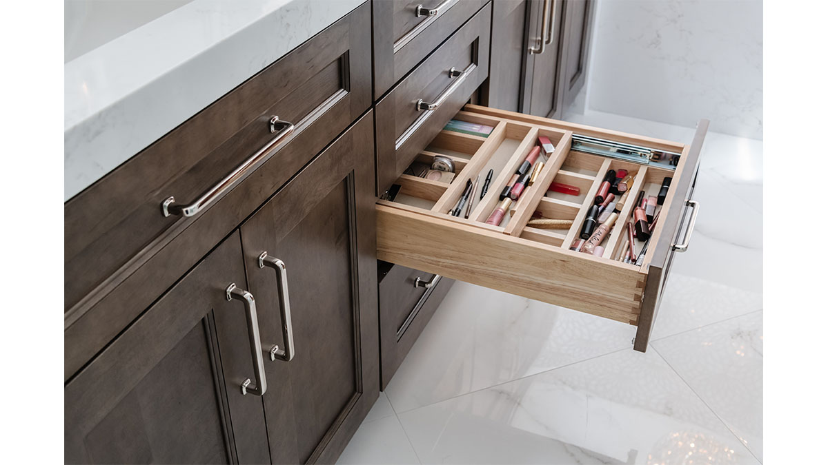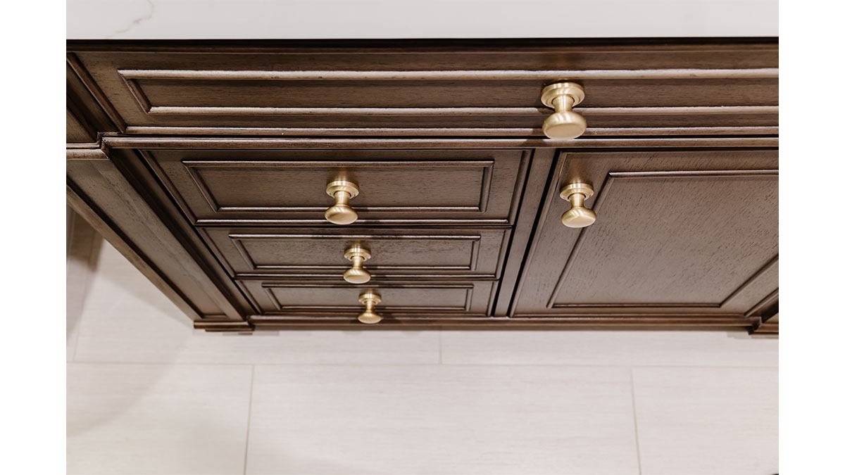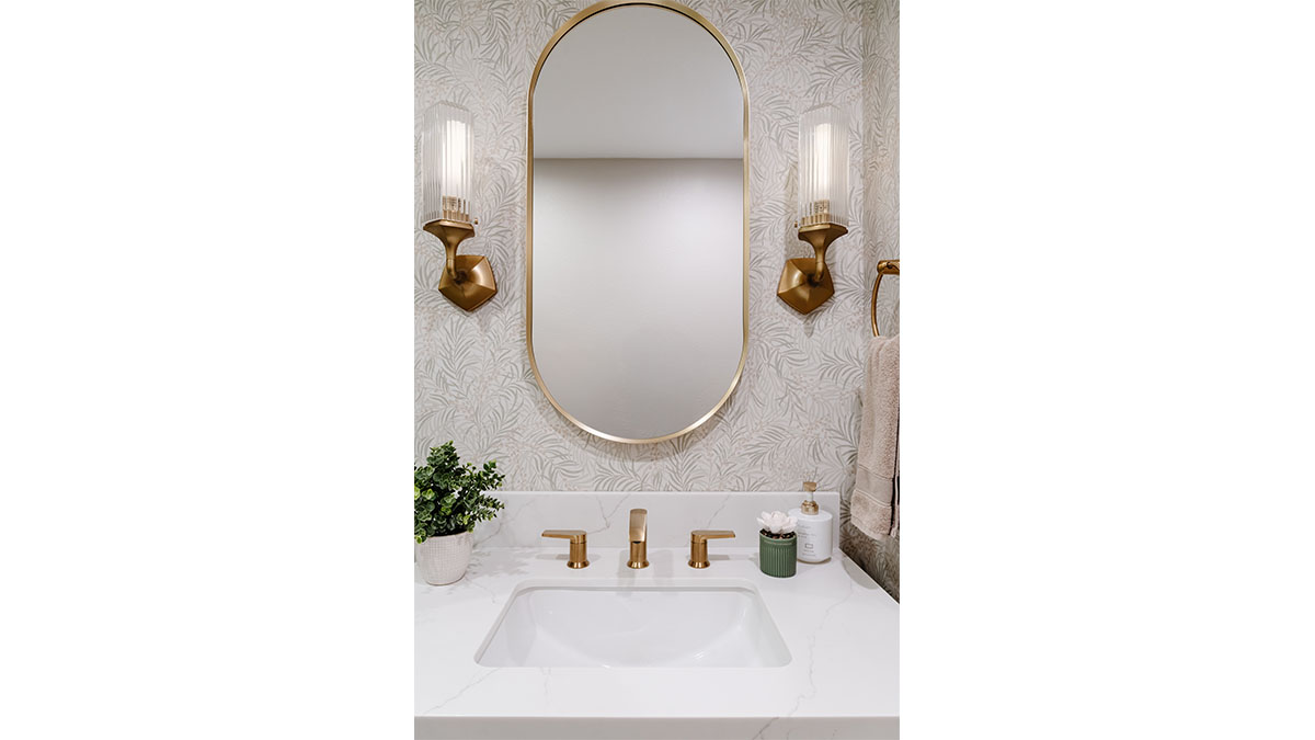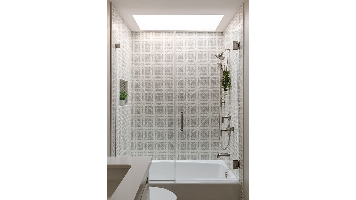 A client with Traditional tastes wanted an overhaul to their builder-grade bathrooms, while still retaining their Traditional style. The Master Bath was a long, narrow space with 2 focal points – the built-in tub at the end of the room, and the vanity which faced the entry. We gave a facelift to both areas with an updated choice of materials and a modern take on the Traditional theme. Replacing the old fiberglass tub with a sleek, rectangular drop-in model, we enclosed it in a quartz platform to match the countertop. To replace the old mirror above the tub, we used a show-stopping backsplash that brings both beauty and elegance to the room. A new vanity of Decora cabinets in Maple Kindling finish, a rich brown, tied in beautifully with the backsplash and quartz. For a sophisticated touch, the counter transitions to a waterfall edge, connecting it to the tub platform. Personalized storage, such as the makeup organizer, adds convenience to the client’s routine. The shower, at the other end of the room is tied in beautifully with a coordinating porcelain. Beveled framed mirrors and a crystal chandelier are refined finishing touches. Each of the guest bathrooms was also refreshed with a modern take on the Traditional theme.