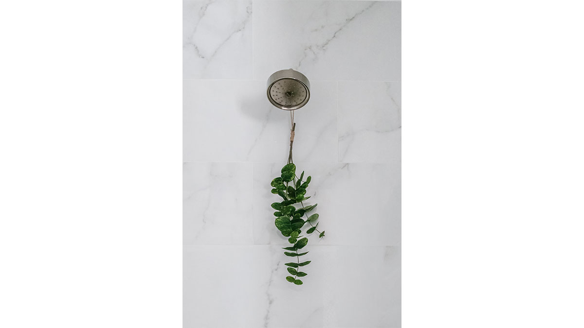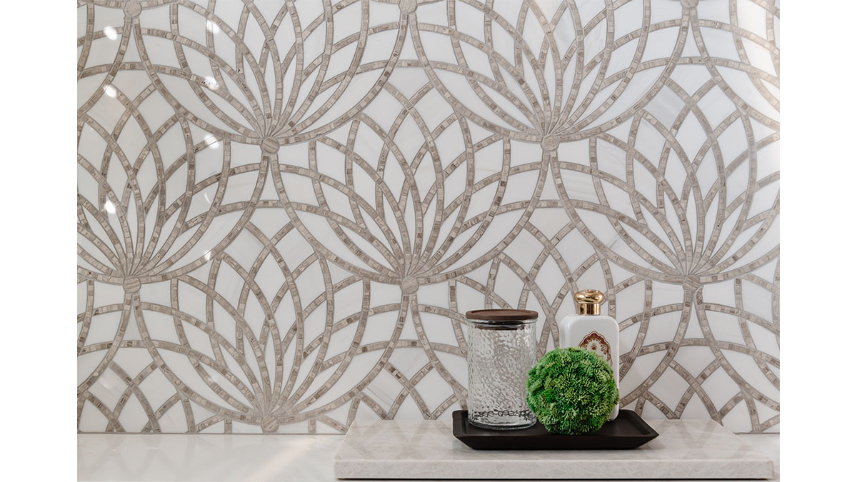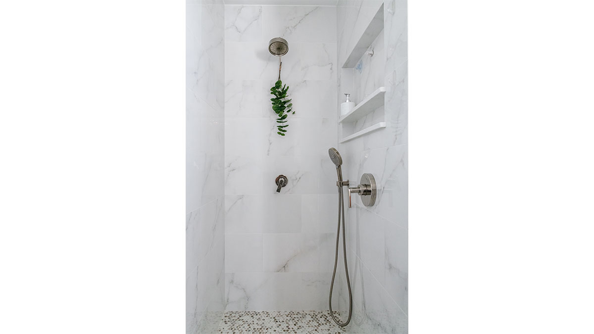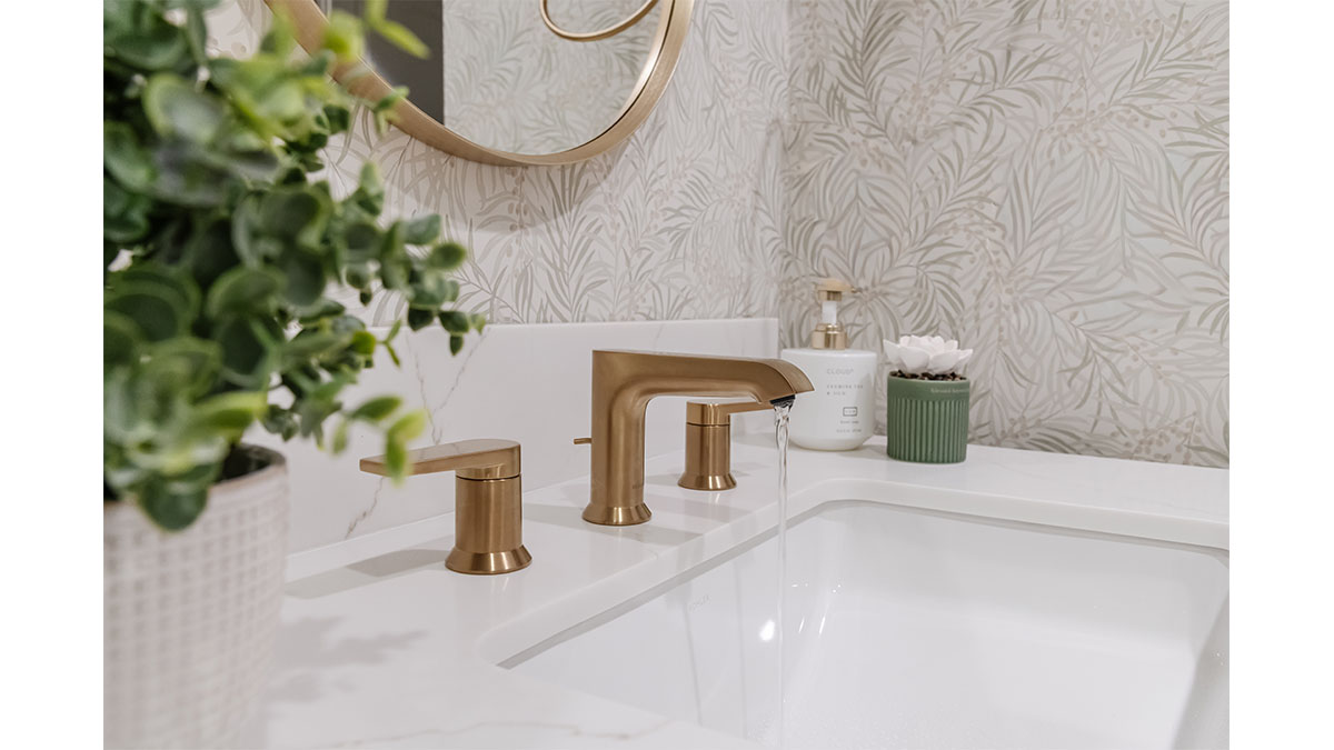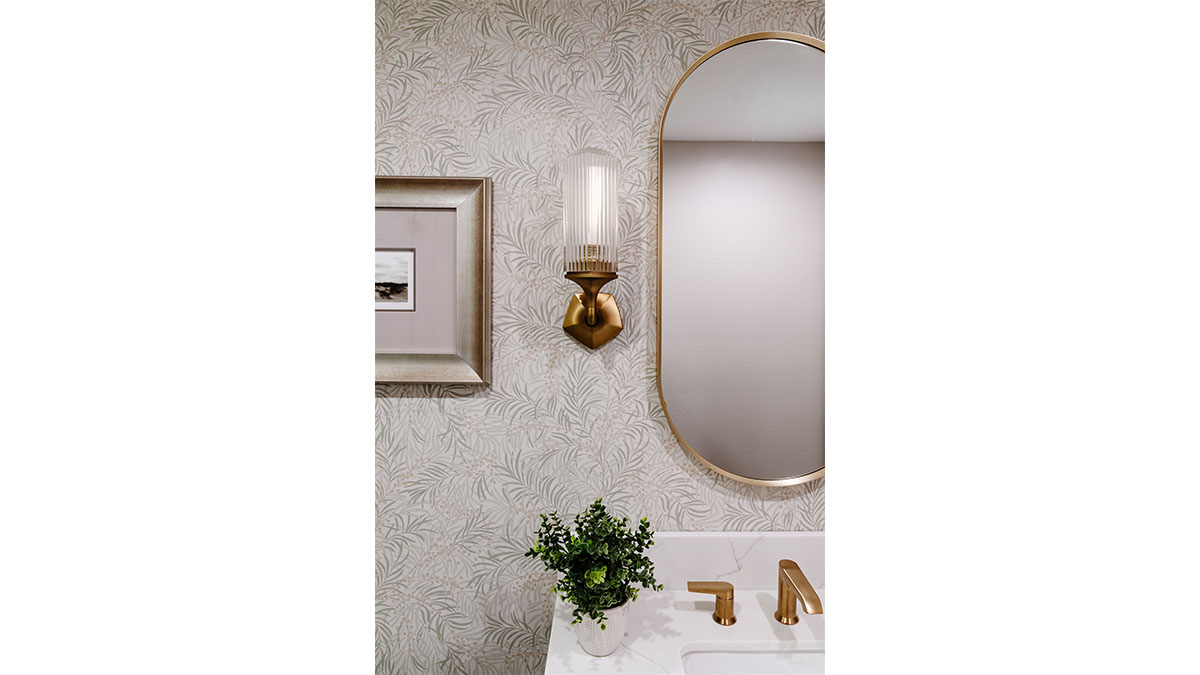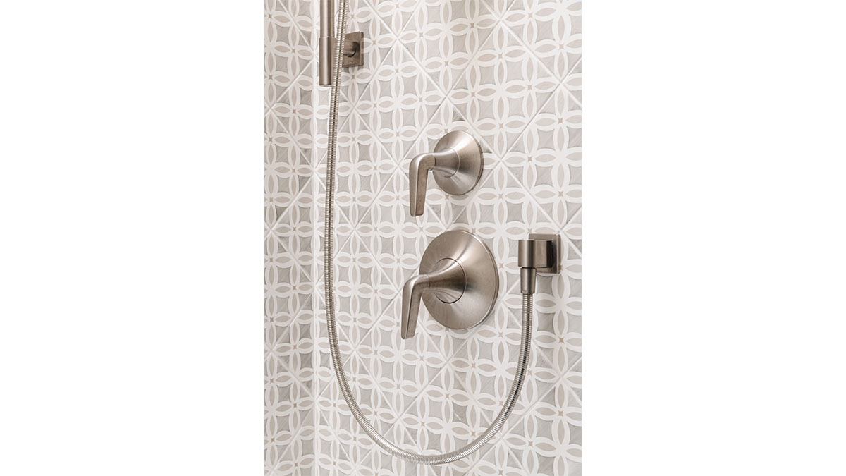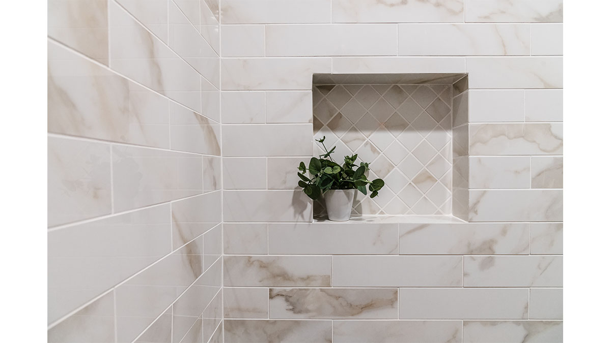 A client with Traditional tastes wanted an overhaul to their builder-grade bathrooms, while still retaining their Traditional style. The Master Bath was a long, narrow space with 2 focal points – the built-in tub at the end of the room, and the vanity which faced the entry. We gave a facelift to both areas with an updated choice of materials and a modern take on the Traditional theme. Replacing the old fiberglass tub with a sleek, rectangular drop-in model, we enclosed it in a quartz platform to match the countertop. To replace the old mirror above the tub, we used a show-stopping backsplash that brings both beauty and elegance to the room. A new vanity of Decora cabinets in Maple Kindling finish, a rich brown, tied in beautifully with the backsplash and quartz. For a sophisticated touch, the counter transitions to a waterfall edge, connecting it to the tub platform. Personalized storage, such as the makeup organizer, adds convenience to the client’s routine. The shower, at the other end of the room is tied in beautifully with a coordinating porcelain. Beveled framed mirrors and a crystal chandelier are refined finishing touches. Each of the guest bathrooms was also refreshed with a modern take on the Traditional theme.